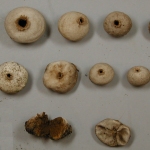 The insides may be white, brown, or black, often with olive tinges, but not purplish. These puffballs are Saprobes, feeding on dead soil matter.