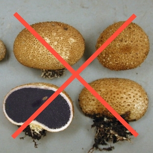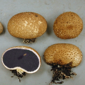 Very young ones can be white inside, but still often have a tinge of purple near the center. The outside can be bumpy or smooth. These puffballs are in the genus Scleroderma, and are Mutualists with nearby trees.