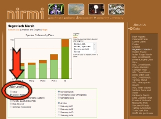 ![]() Clicking on this link will get you to the graphing page, shown below left. By default, this will show a graph of species richness (native in green, non-native in brown) broken down by plot within the site you've selected. Other graph types and/or options can be selected directly below the graph in the "graph options" section (as shown below right). ![]() ![]() ![]() << Back to main tutorial page